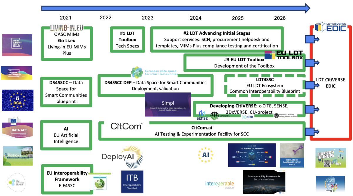 Pour cela, les acteurs du projet travaillent en étroite collaboration avec les grandes initiatives européennes, présentées dans le schéma ci-dessus, telles que la LDT Toolbox de l'UE, GAIA-X pour des données fiables et CitiVERSE pour l'innovation urbaine, LDT4SSC rassemble tous ces éléments au sein d'un écosystème puissant.